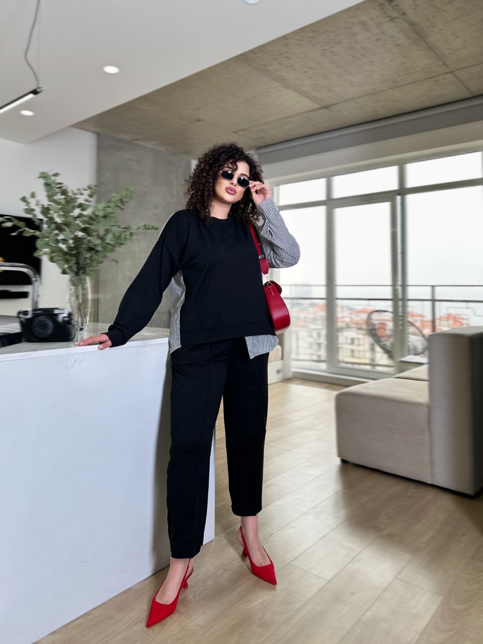 Этот костюм изготовлен из двунитки и коттона. Брюки с высокой посадкой, свободного кроя, длина 7/8. Хорошая посадка. Кофточка – интересное сочетание рубашки и худи.