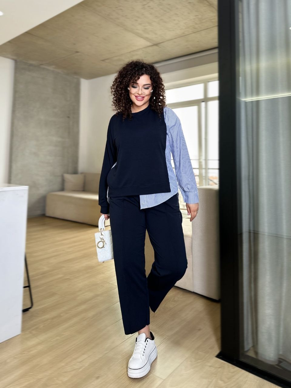 Костюм изготовлен из двунитки и коттона. Брюки с высокой посадкой, свободного кроя, длина 7/8.