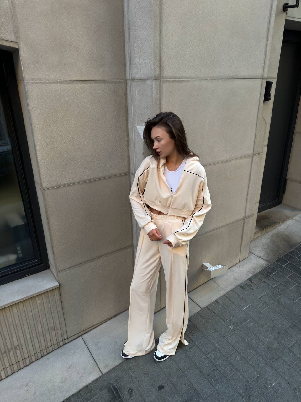 Стильный костюм двухнить (кофта+штаны с разрезами) бежевый