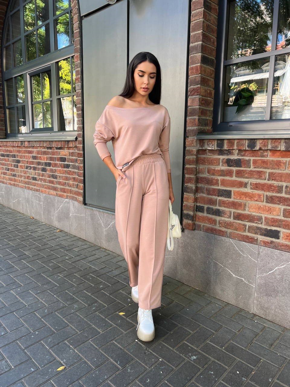 Головна » Магазин » Одяг » Жіночі костюми » Стильный костюм кофта с широкой горловиной и прямые брюки бежевый