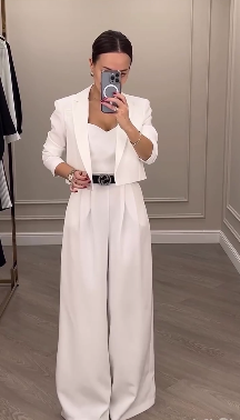 Стильный костюм тройка (топ+свободные брюки+укороченный пиджак) молочный
