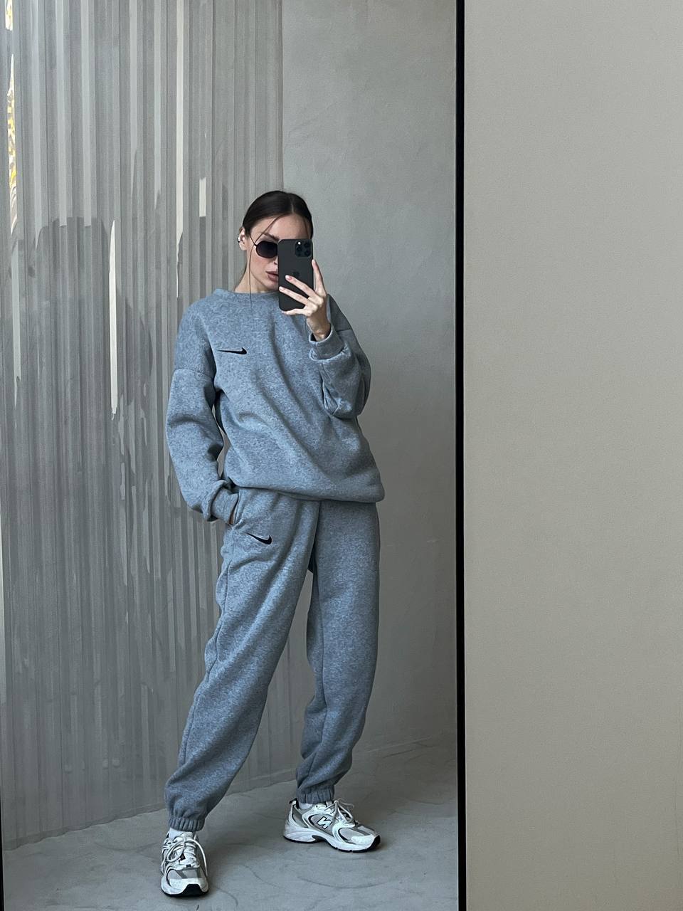 Уютный, теплый, базовый костюм на каждый день. Удлиненный объёмный свитшот, манжеты из основной ткани; высокие джогеры с карманами, пояс на резинке, регулируемый шнурком, на манжетах резиночки.