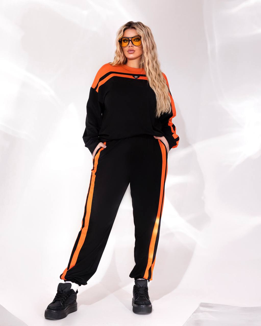 Брюки, высокая посадка, на резинке, внизу манжет, карманы. На брюках лампас. На кофте интересная нашивка.