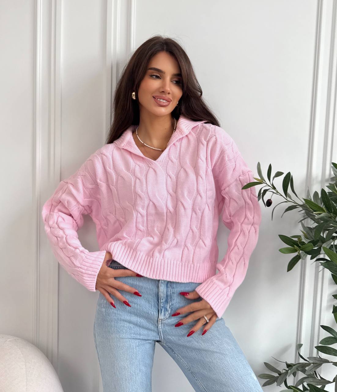 Свитер с воротником поло (Объемная вязка косичка) барби