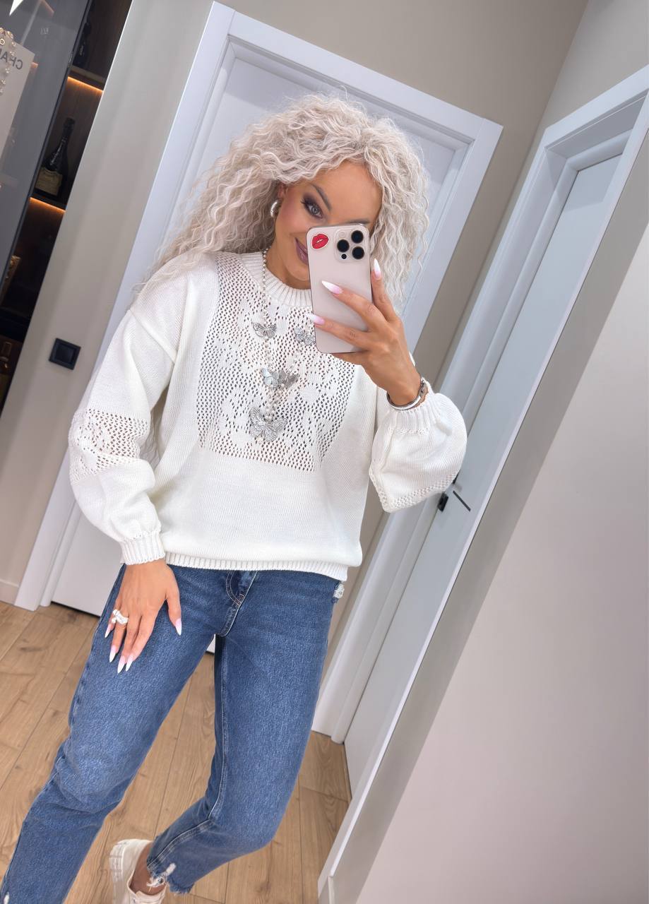 • Ажурное плетение с цветочным мотивом на груди и рукавах