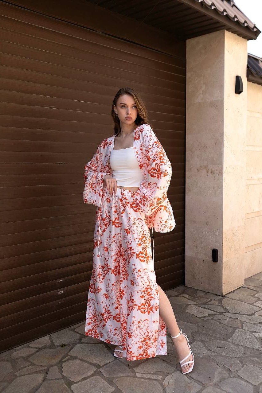 Свободный льняной костюм (кимоно с кулиской на талии+объемные брюки с разрезом) принт оранжевый