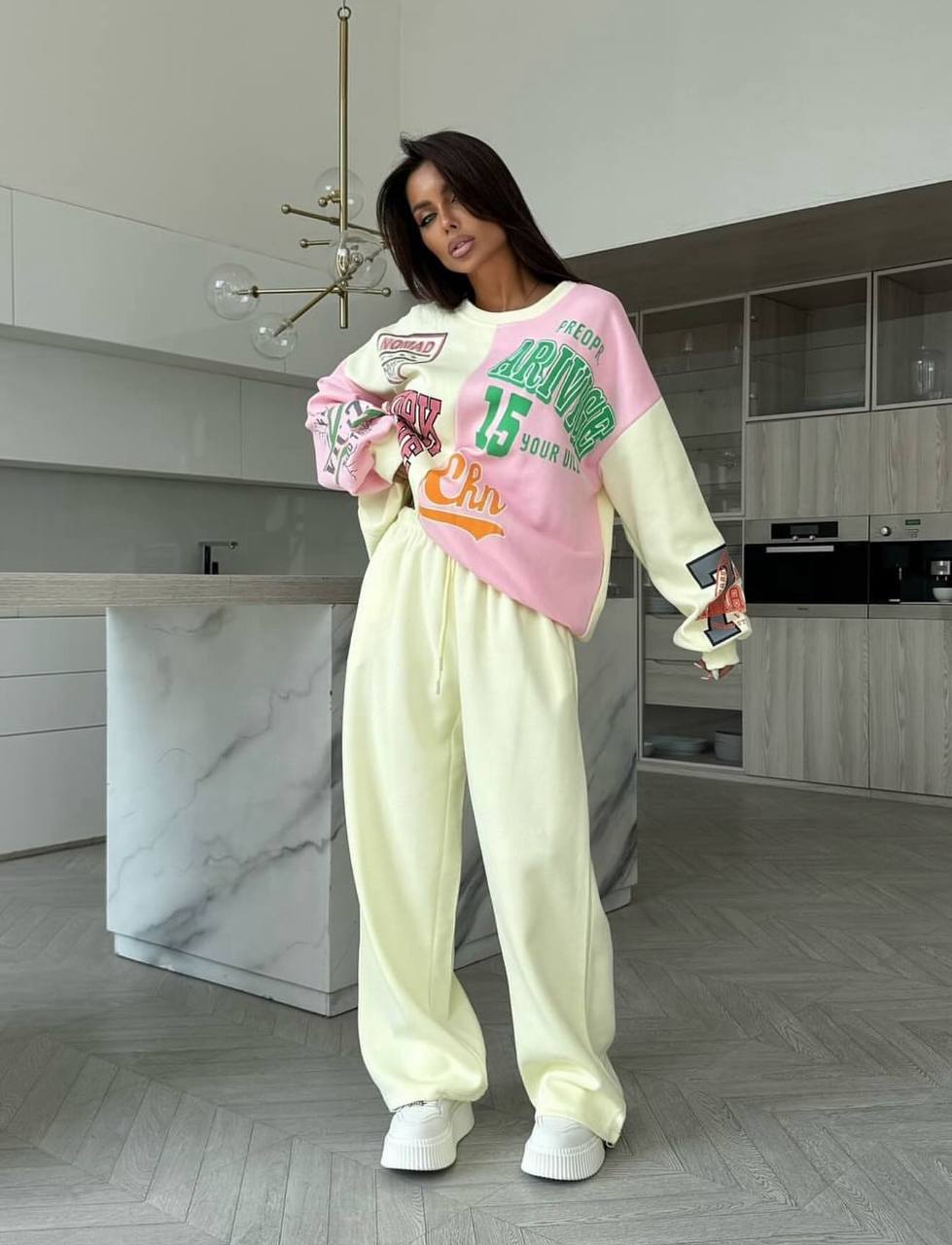 Головна » Магазин » Одяг » Жіночі спортивні костюми » Свободный спортивный костюм с накатом: кофта+штаны (двунитка) лимон