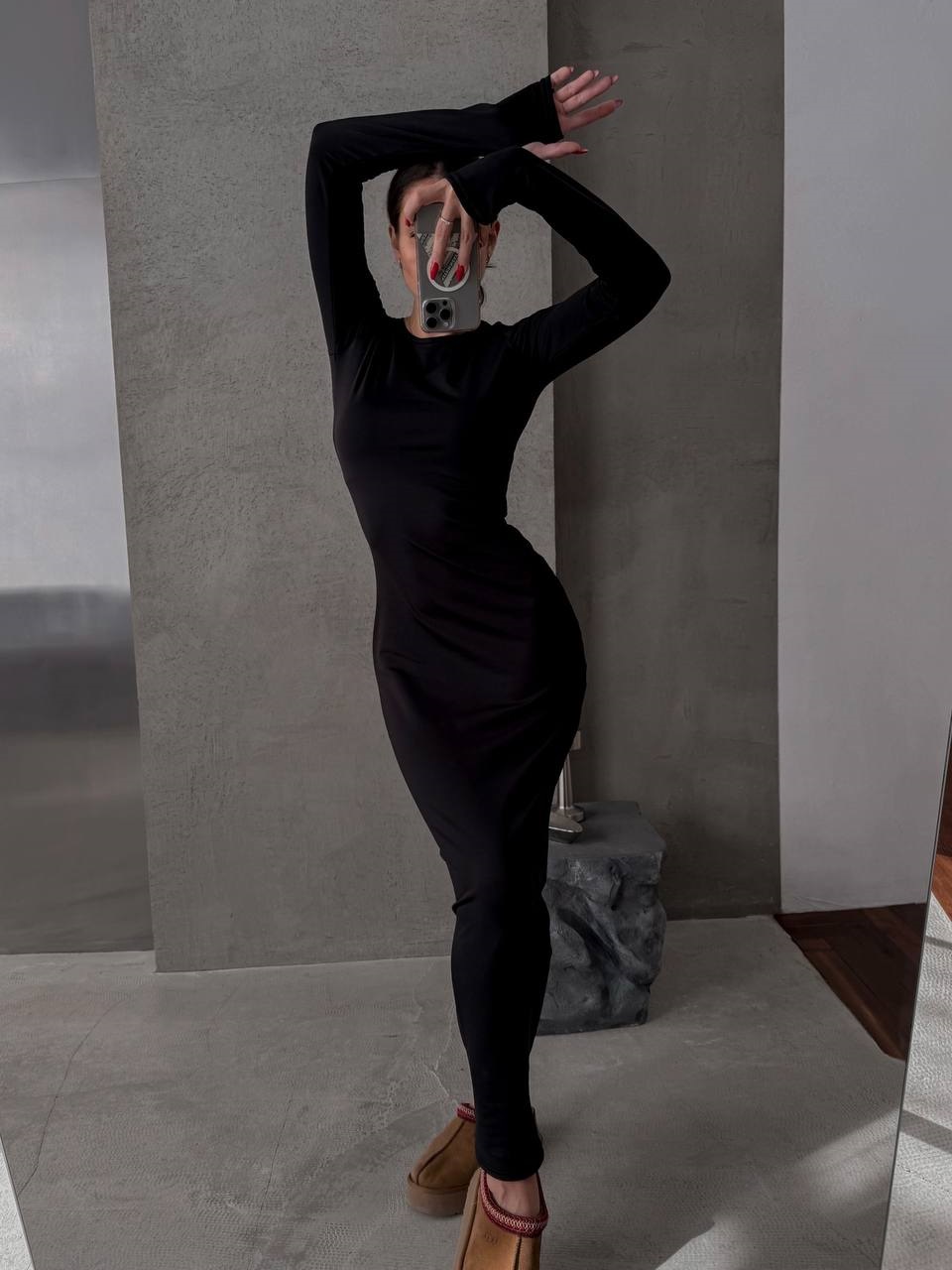 Теплое платье по фигуре с разрезами для пальчиков длиной макси черный