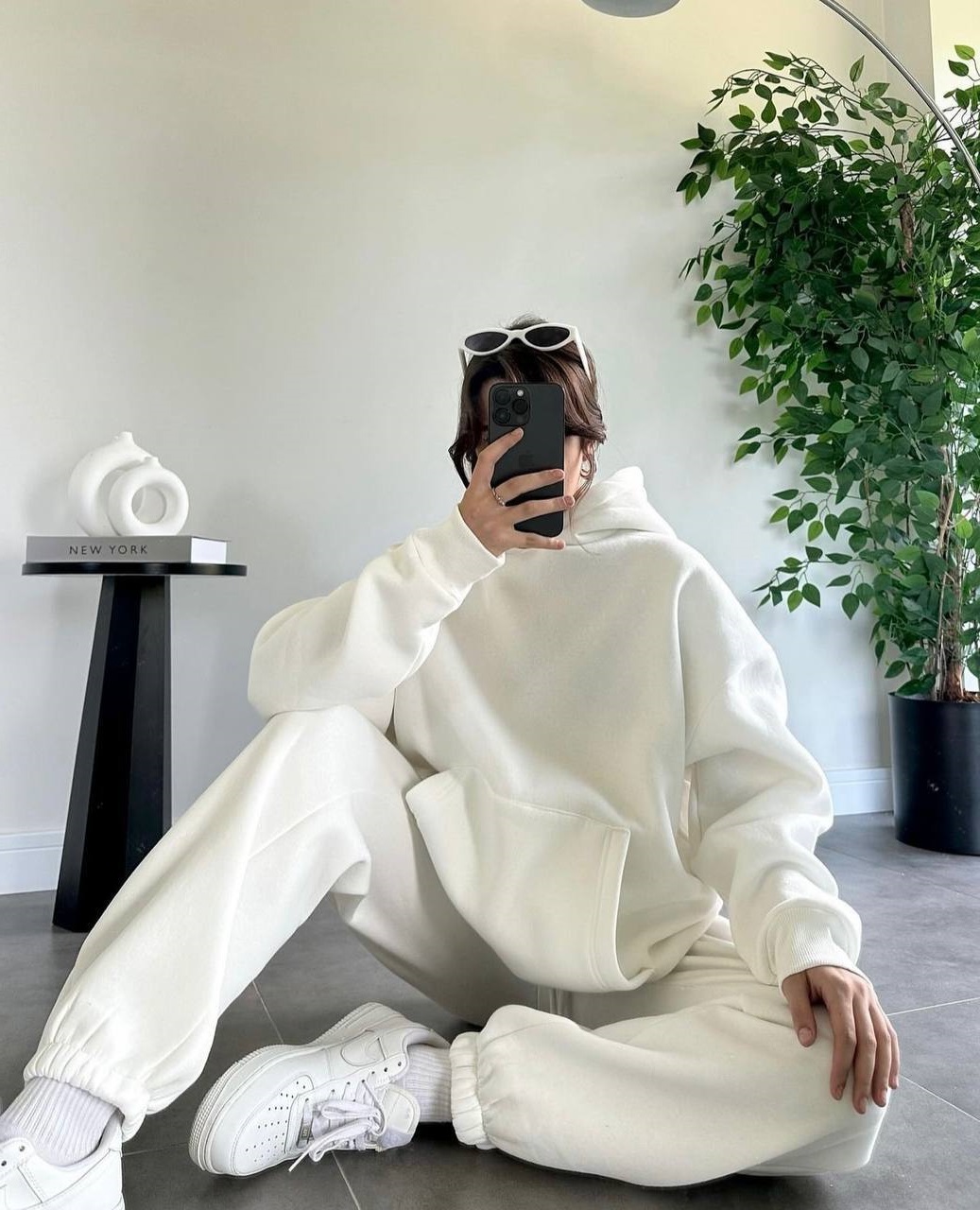Теплый базовый костюм оверсайз (классические худи с капюшоном+джоггеры) молочный