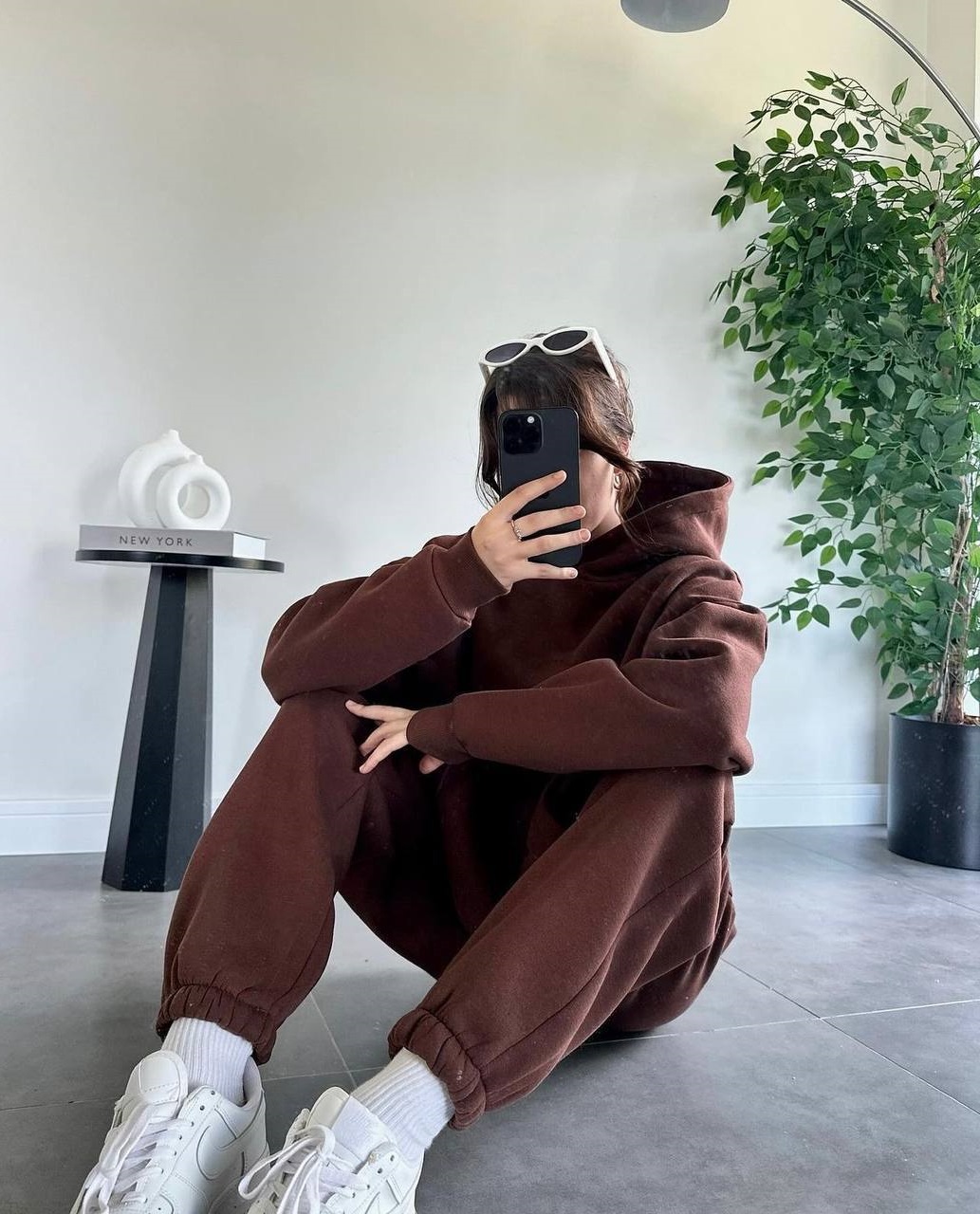 Теплый базовый костюм оверсайз (классические худи с капюшоном+джоггеры) шокодад