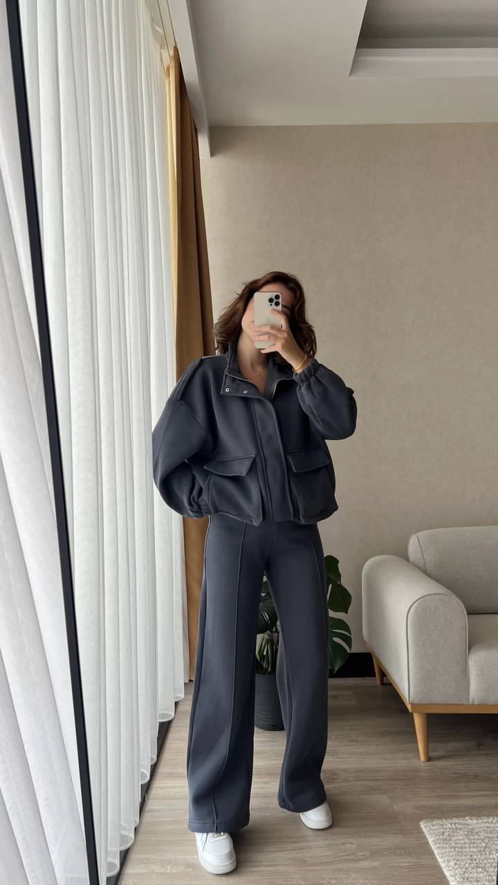 Теплый костюм двойка Бомбер с накладными карманами и брюки прямого кроя