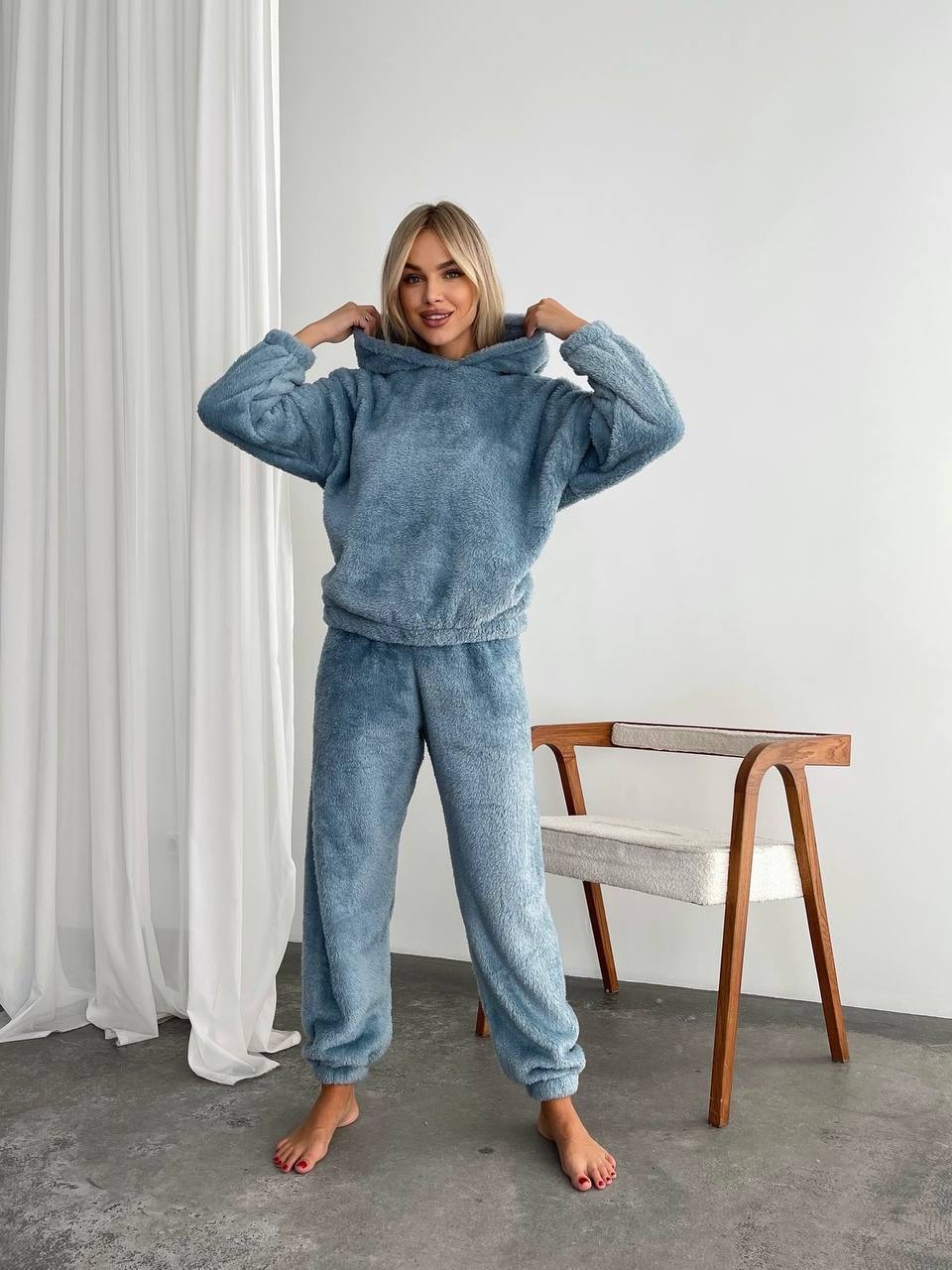 Теплый махровый костюм кофта с ушками + штаны серо-голубой
