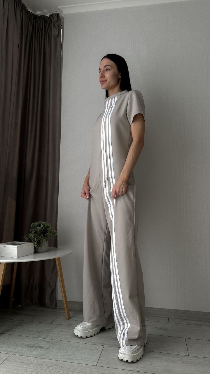 Трендовый комбинезон с боковыми лампасами двухнитка серо-бежевый