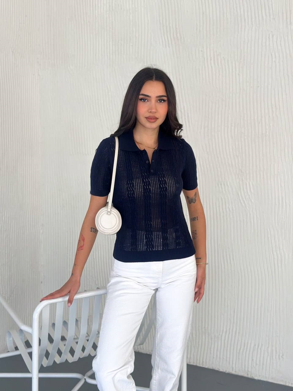 Головна » Магазин » Одяг » T -сорочки Майкі » Трикотажная футболка поло с ажурными дорожками темно синий