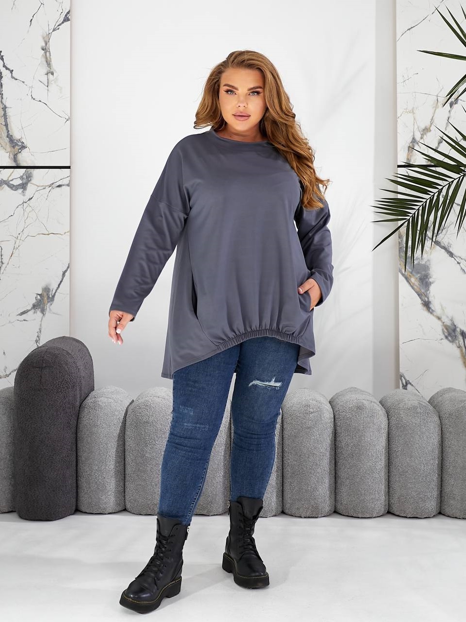 Трикотажная туника с ассиметричним краем по низу+карманами графит