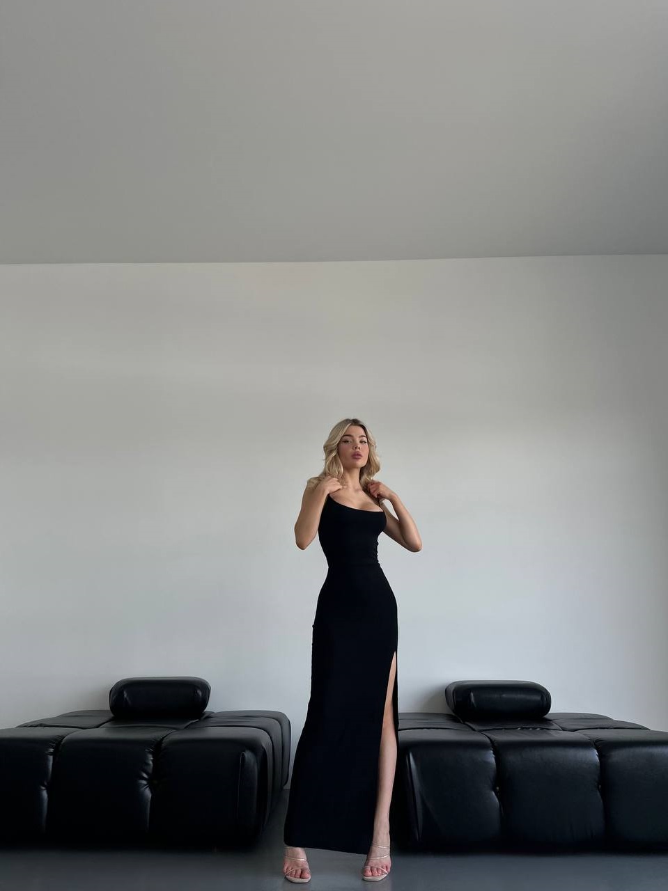 Трикотажное летнее платье с разрезом по ноге на бретелях с открытой спинкой черный
