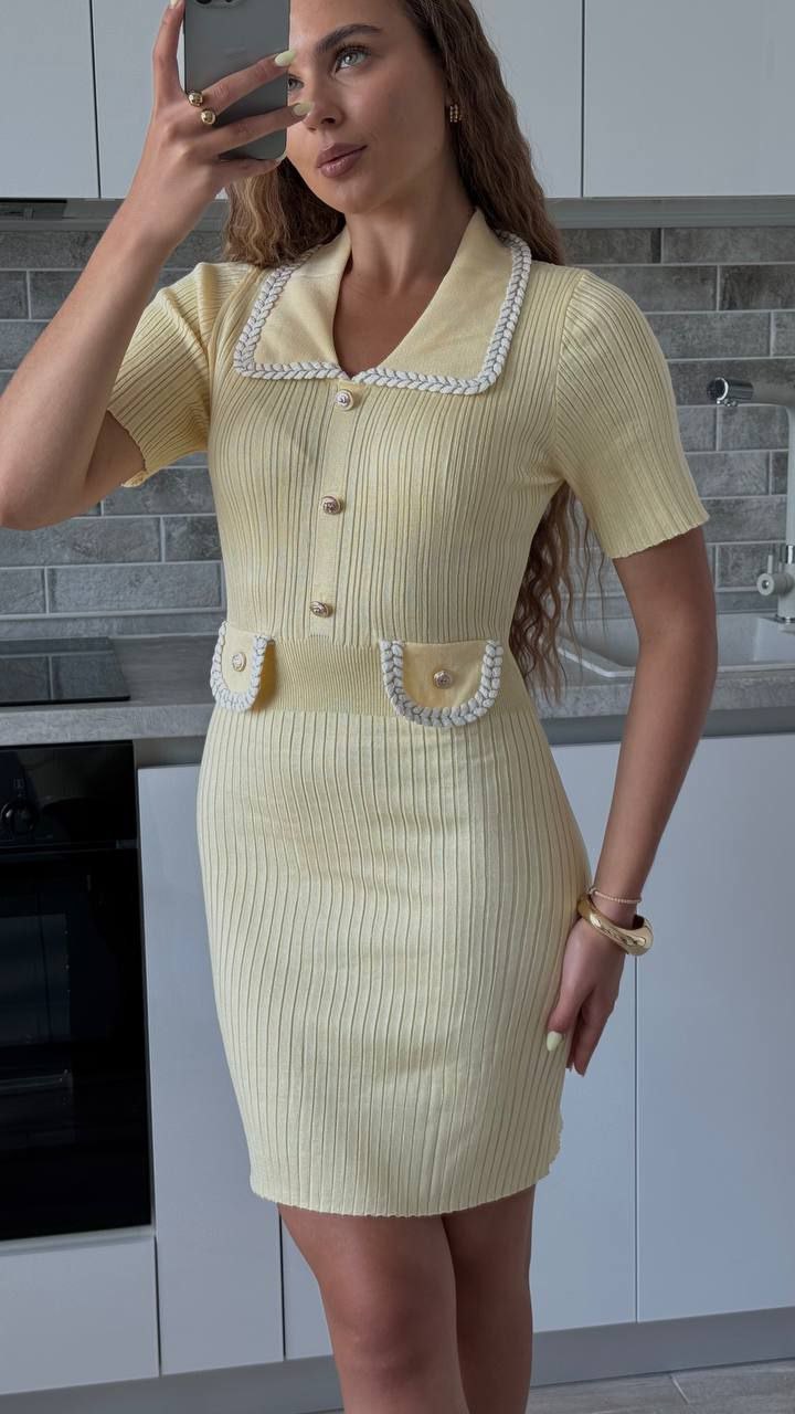 Трикотажное Платье по фигуре с акцентной отделкой воротничка+кармашков лимон