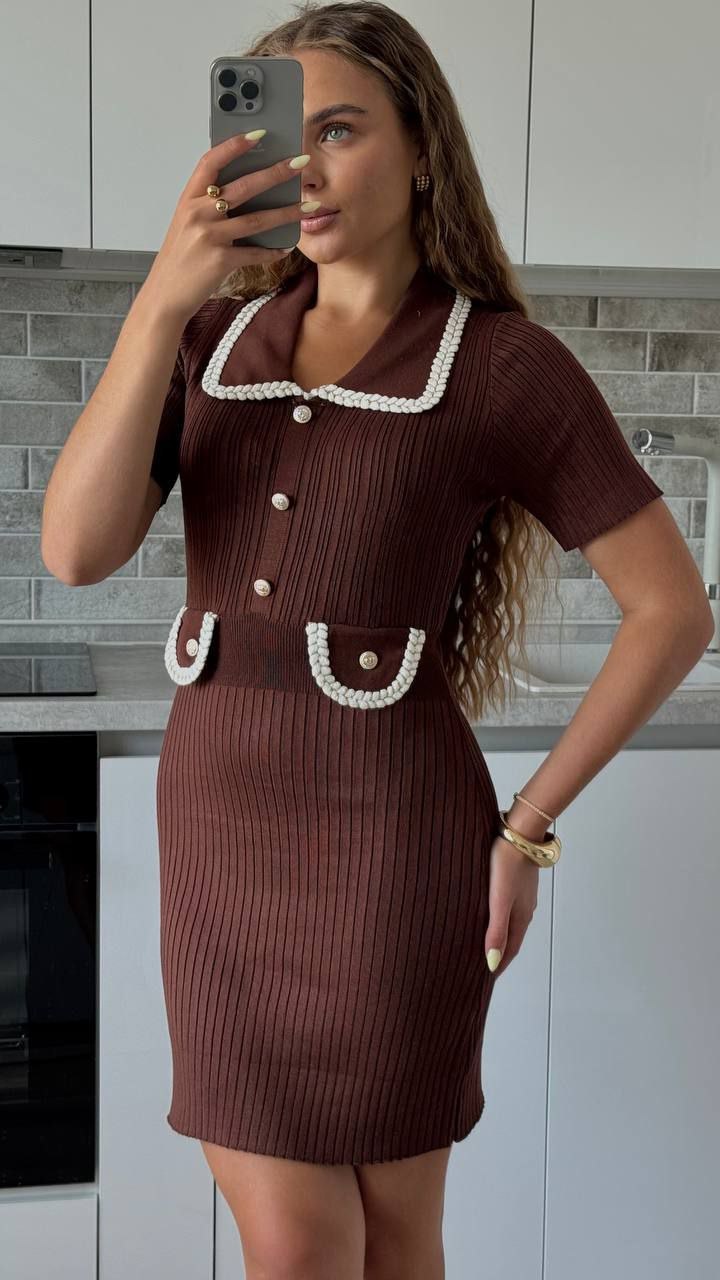 Трикотажное Платье по фигуре с акцентной отделкой воротничка+кармашков шоколад