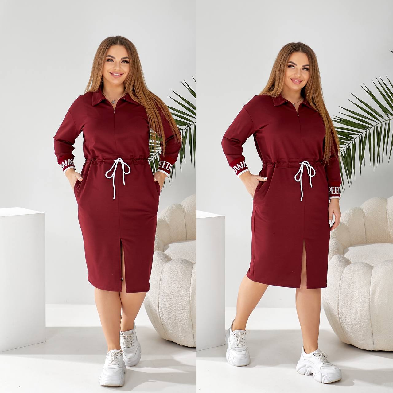 Трикотажное платье прямого кроя+разрез по переду+воротник стойка на молнии+в талии резинка бордо
