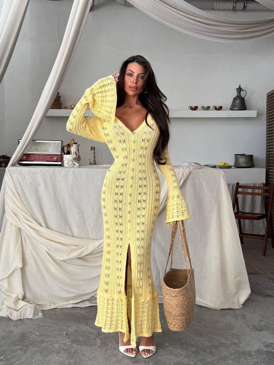 Трикотажное полупрозрачное платье-туника длиной макси ажурный узор желтый