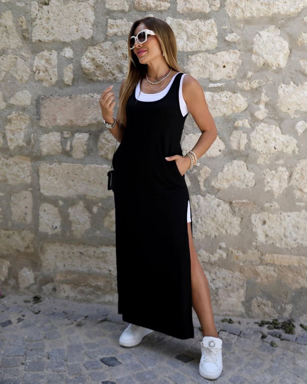 В комплект входит две отдельные вещи, удлиненное платье-майка и черный сарафан длиной макси.