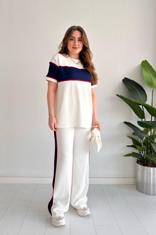 Удлиненная футболка, брюки высокая посадка, круговая резинка, свободный крой.