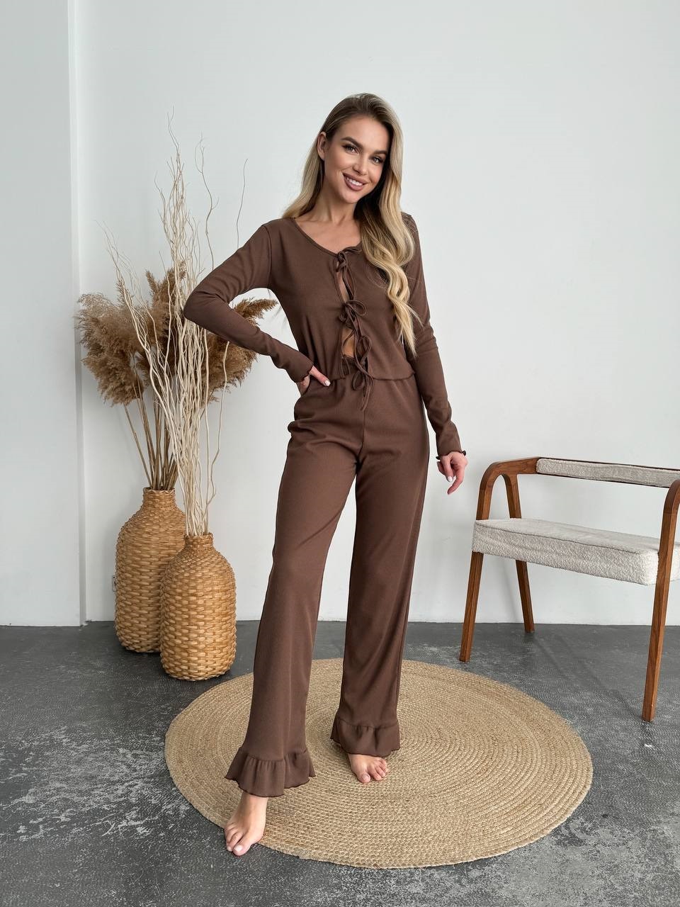 Трикотажный костюм (брюки с воланчиком по низу+кофта на завязочках) коричневый