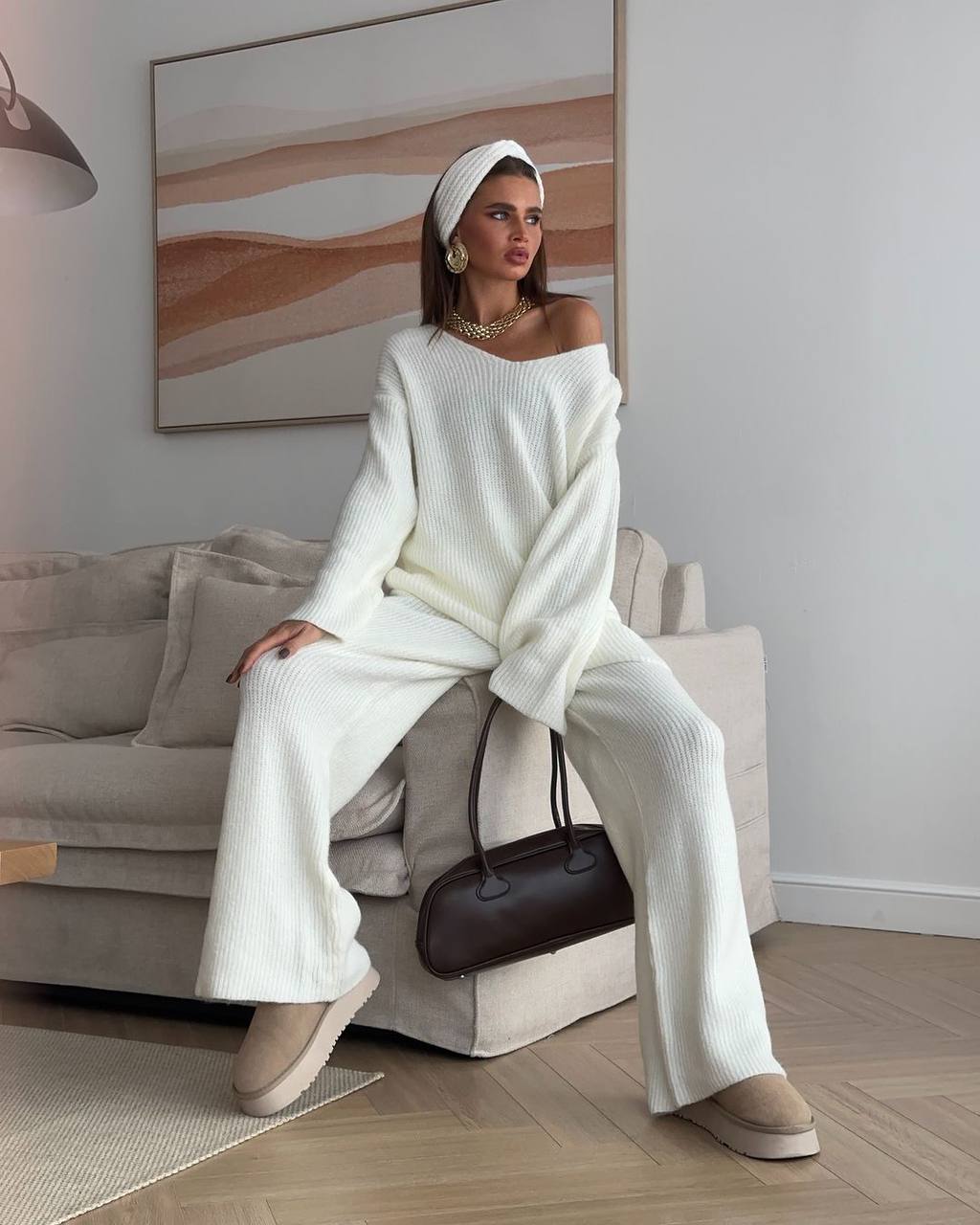 Базовый костюм на флисе, который станет решением для любого события, легко впишется в Ваш гардероб. Ткань очень приятна к телу, что одев этот костюм, вы его не захотите снимать.Брюки с высокой посадкой, кофта удлиненная с v-образным вырезом, можно обнажать одно плечо