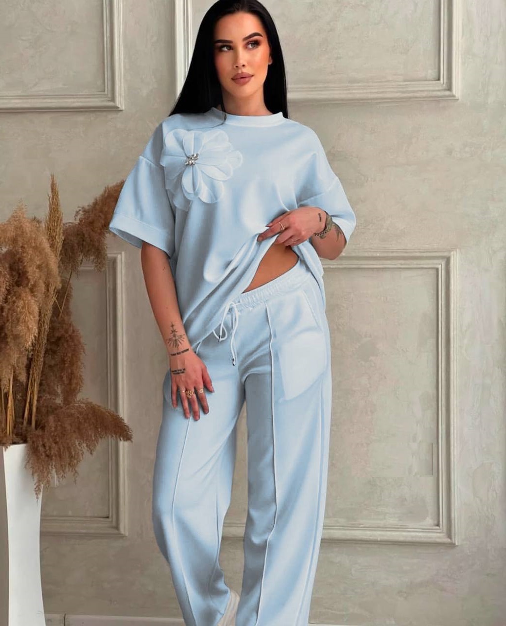 Головна » Магазин » Одяг » Жіночі костюми » Трикотажный костюм (брюки со стрелками+свободного кроя кофта с акцентным цветком) голубой