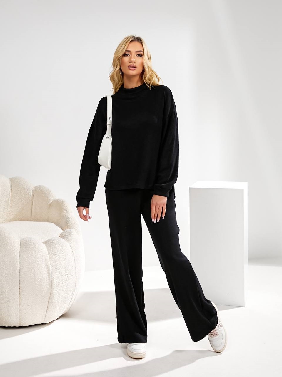 Трикотажный костюм из ангоры (брюки прямого кроя+кофта с разрезами по бокам) черный