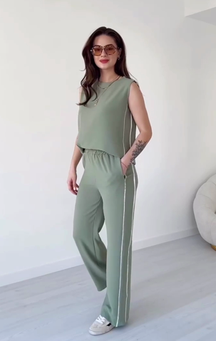 Трикотажный костюм из двухнитки с контрастным кантом (кофта прямого кроя+брюки з карманами) оливка
