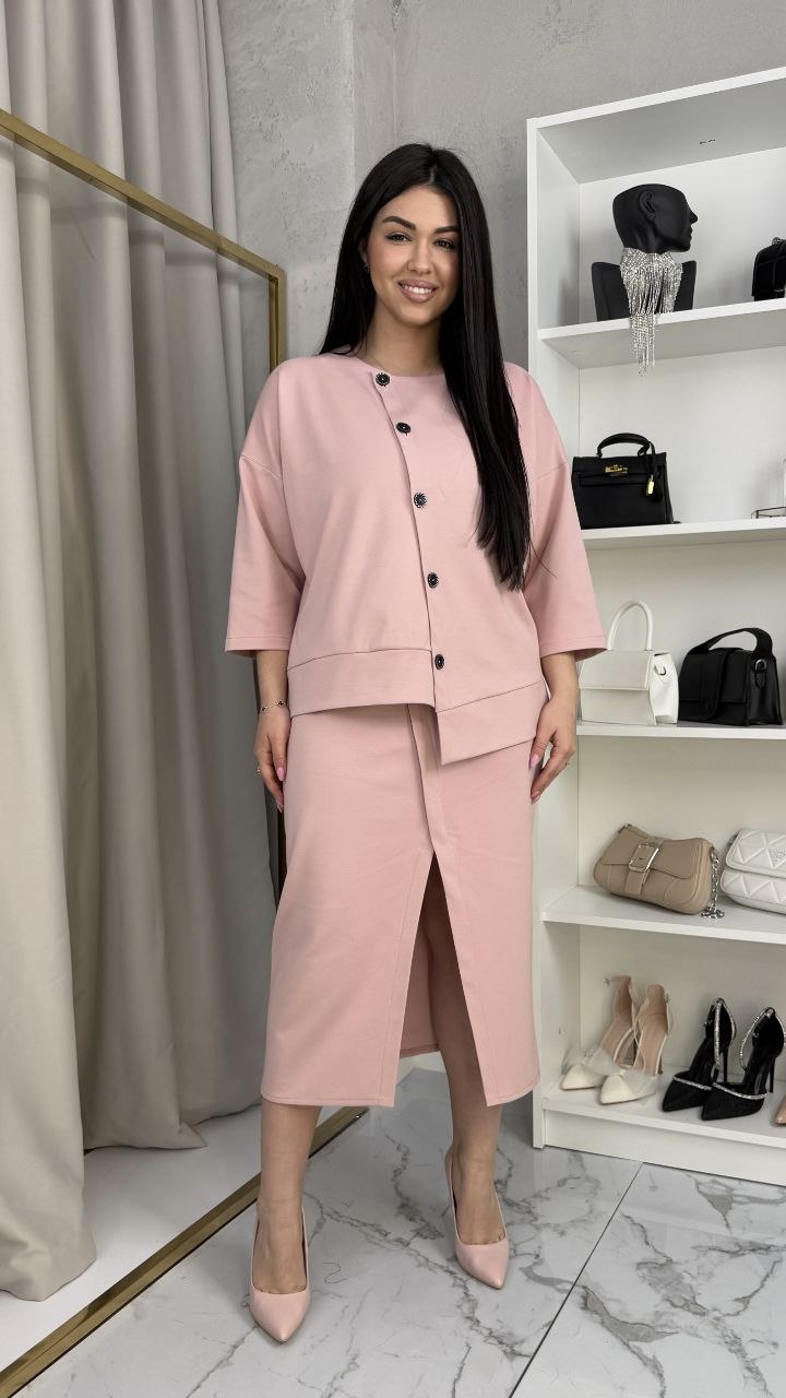 Будьте першим, хто залишив відгук “Трикотажный костюм (кофта с асимметричной застежкой+юбка-карандаш с разрезом) пудра”“