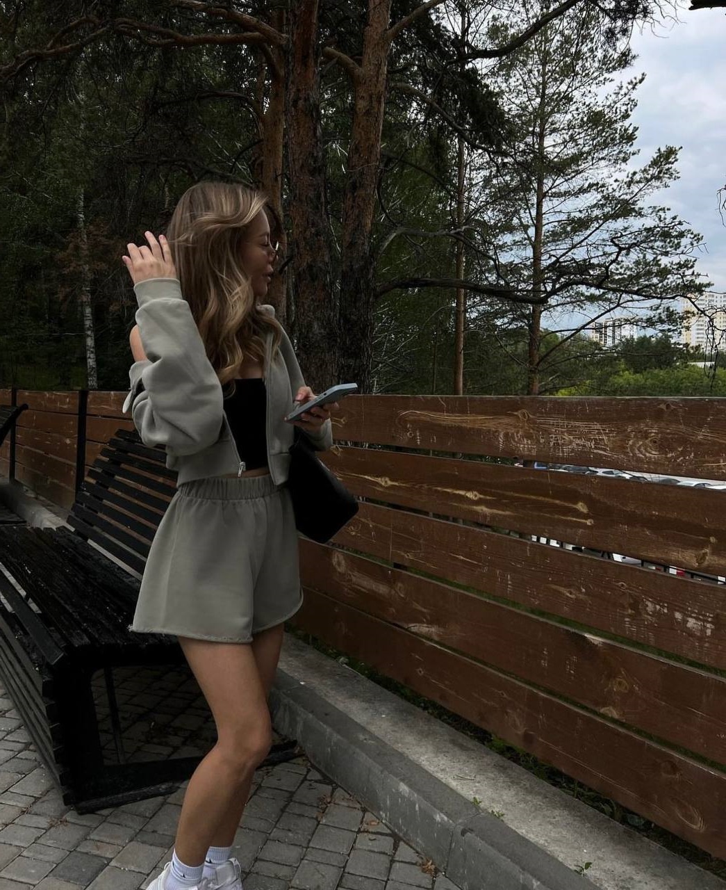 Трикотажный костюм (кофта с двойным капюшоном+шорты) оливка