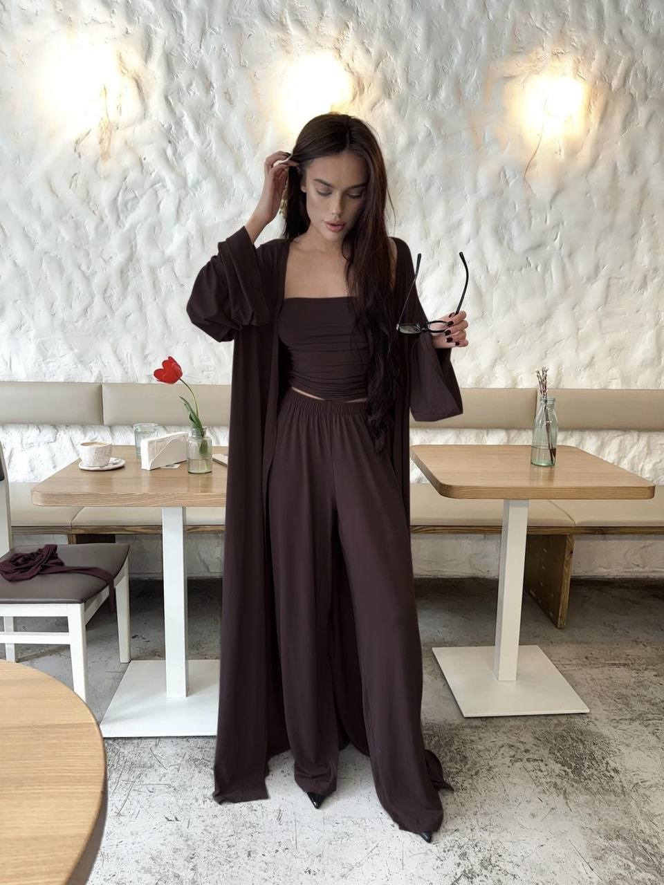 Трикотажный костюм (макси кардиган+брюки палаццо оверсайз+топ с резиночками) шоколадный