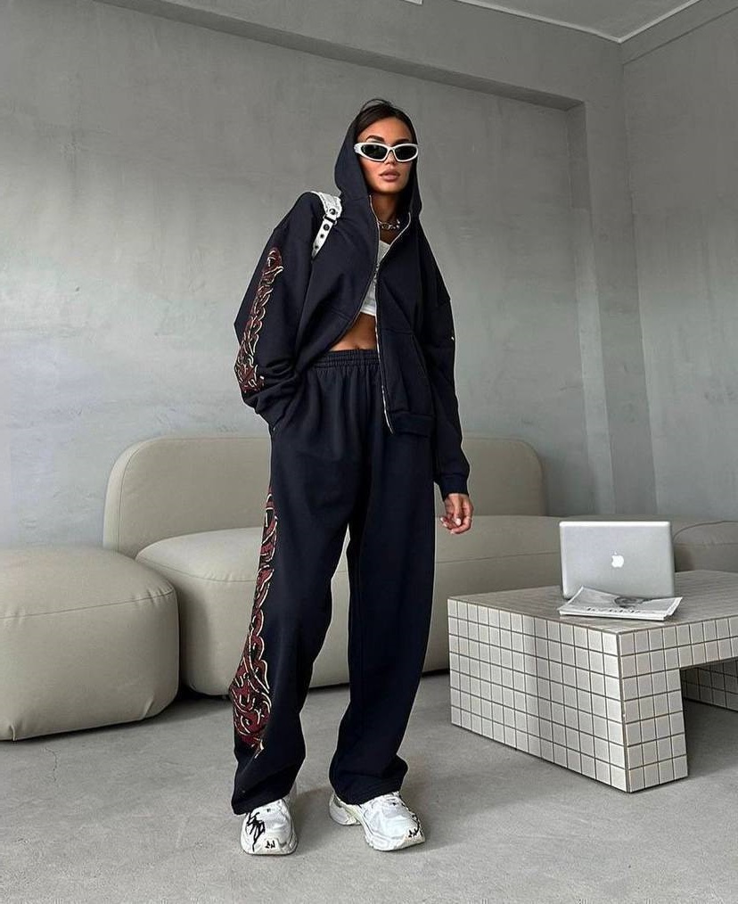 Костюм состоит из цельнокройных широких брюк и кофты на молнии.