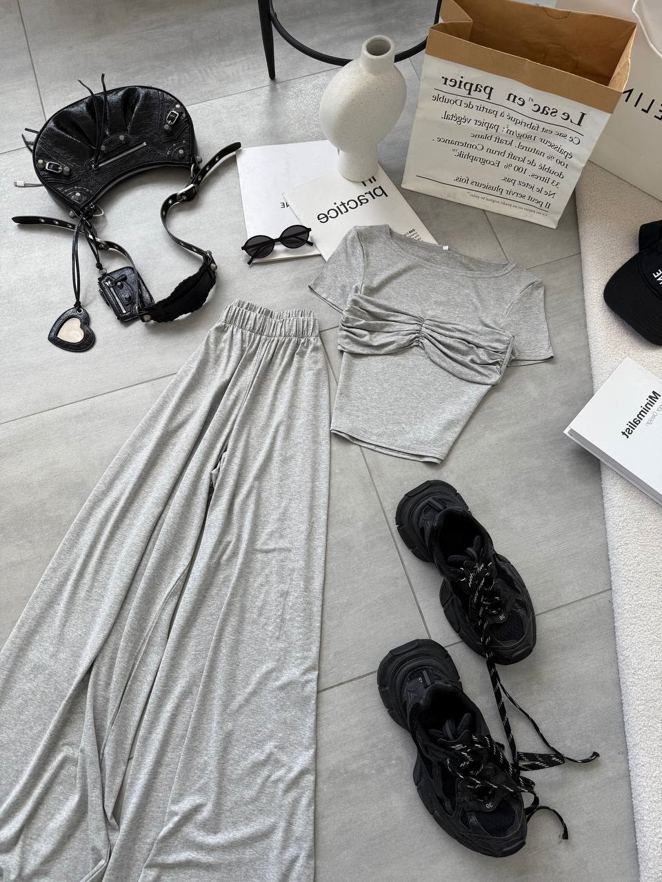 Топ дополнен имитацией бра, брюки на высокой посадке, широкого свободного кроя.