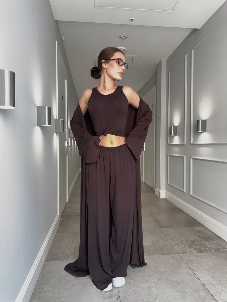 Трикотажный костюм тройка из вискозы (кимоно+топ+палаццо) шоколад