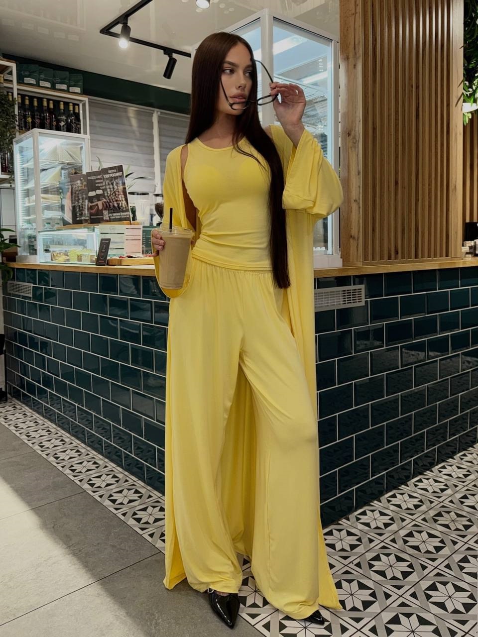 Макси кимоно, штаны палаццо оверсайз и топ американка подходит и идеально садится на любые параметры.