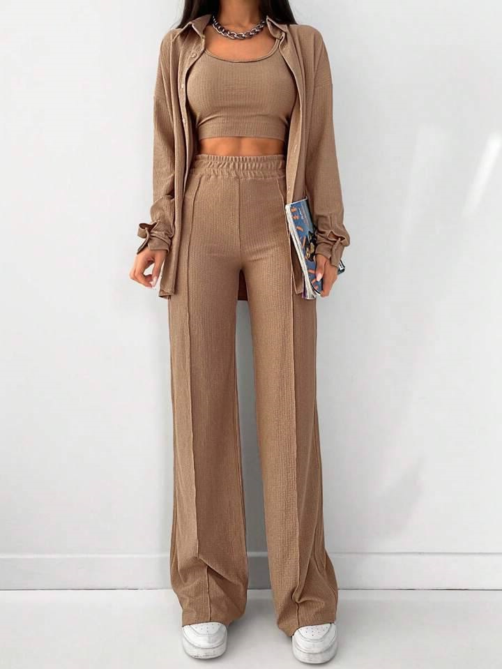 Будьте першим, хто залишив відгук “Трикотажный костюм тройка (рубашка+топ+свободные брюки с отстроченными стрелками) бежевый”“