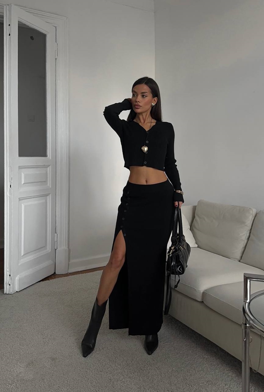 Трикотажный костюм (укороченная кофта на молнии+прямая юбка длиной макси с глубоким разрезом) черный