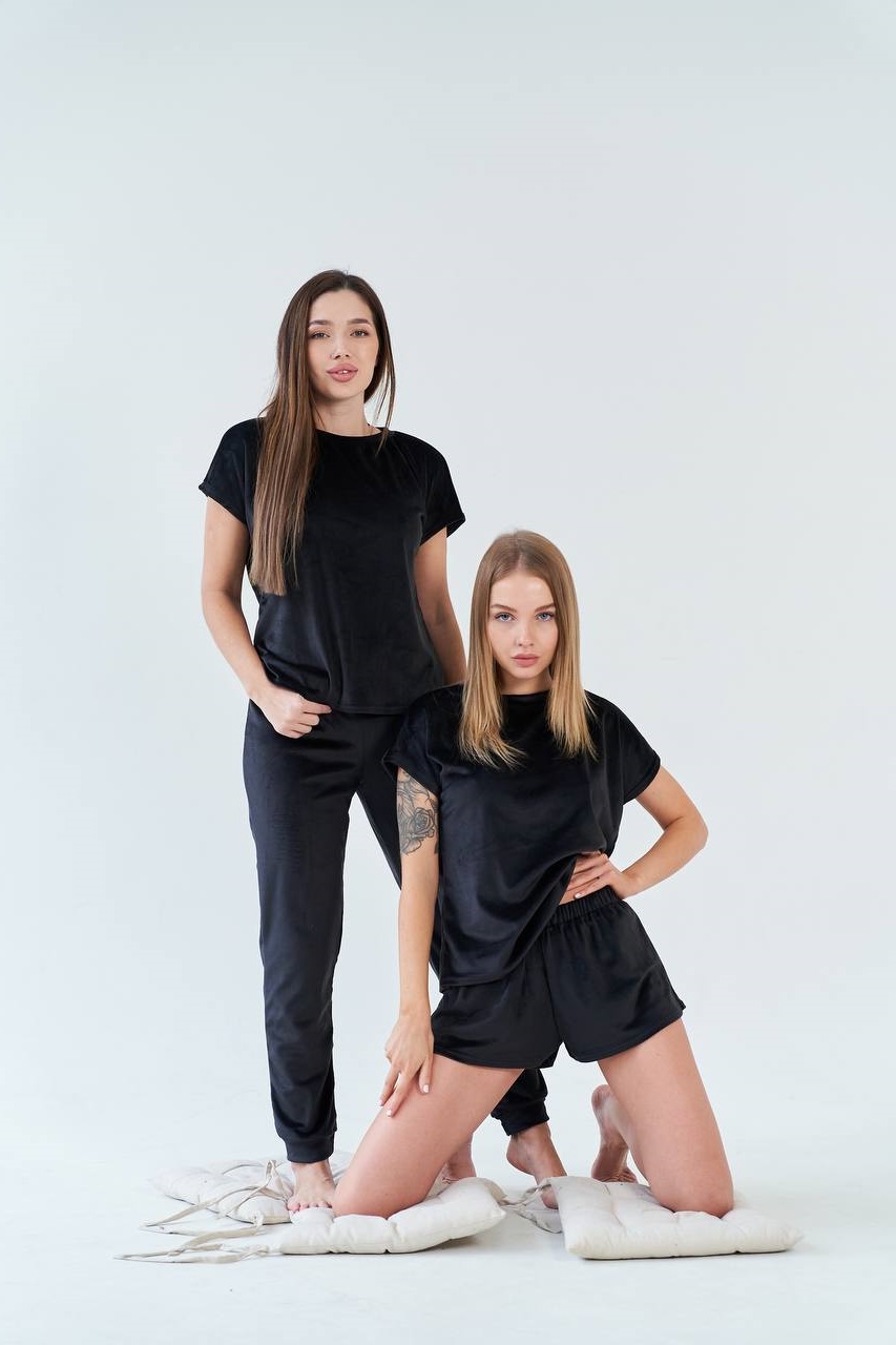 Женский приятный к телу комплект тройка( футболка, шорты, штаны). Футболка свободного кроя. Шорты короткие, на высокой посадке. На штанах присутствуют манжеты. Ткань: плюш