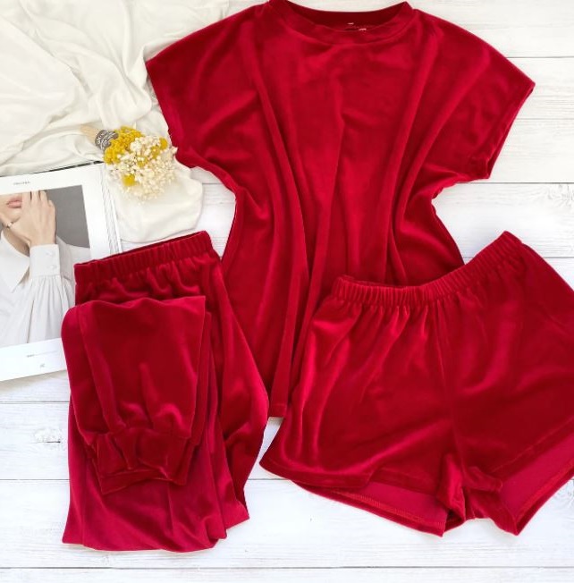 Женский приятный к телу комплект тройка( футболка, шорты, штаны). Футболка свободного кроя. Шорты короткие, на высокой посадке. На штанах присутствуют манжеты. Ткань: плюш