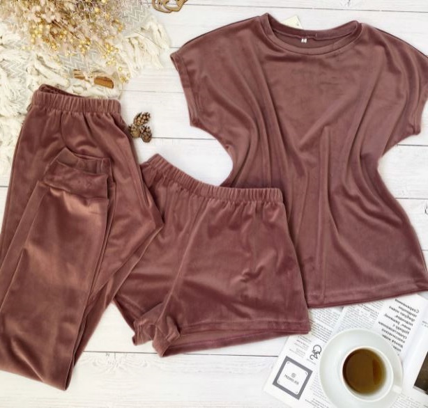 Женский приятный к телу комплект тройка( футболка, шорты, штаны). Футболка свободного кроя. Шорты короткие, на высокой посадке. На штанах присутствуют манжеты. Ткань: плюш