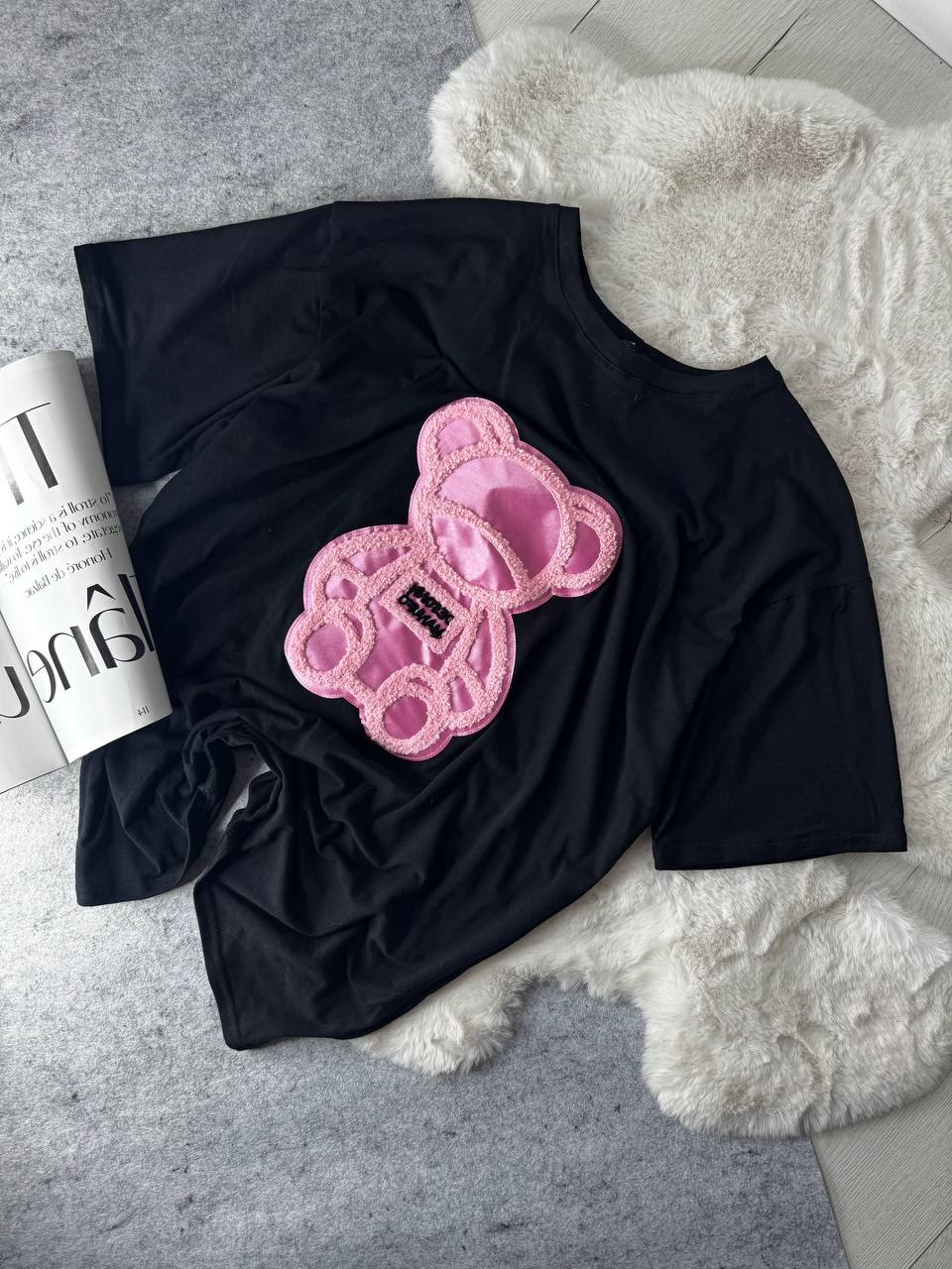 Головна » Магазин » Одяг » T -сорочки Майкі » Удлиненная футболка с ярким накатом принт Мишка черный+розовый
