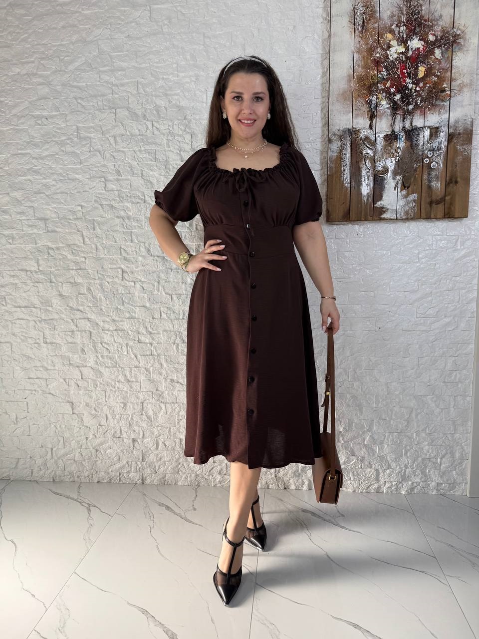 Удлиненное платье на пуговицах свободного кроя со шнуровкой по спинке+по горловине кулиска шоколад