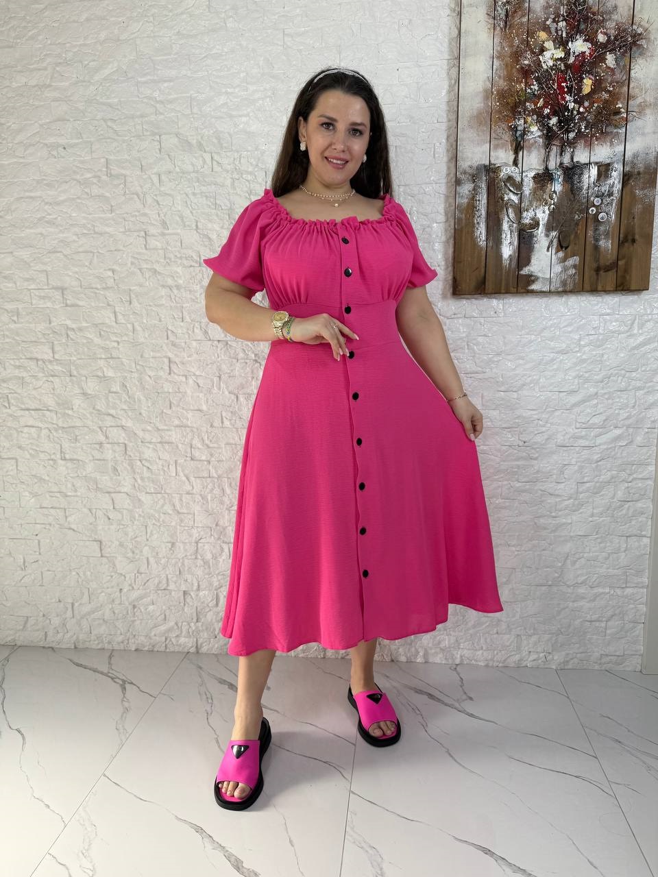 Удлиненное платье на пуговицах свободного кроя со шнуровкой по спинке+по горловине кулиска малина