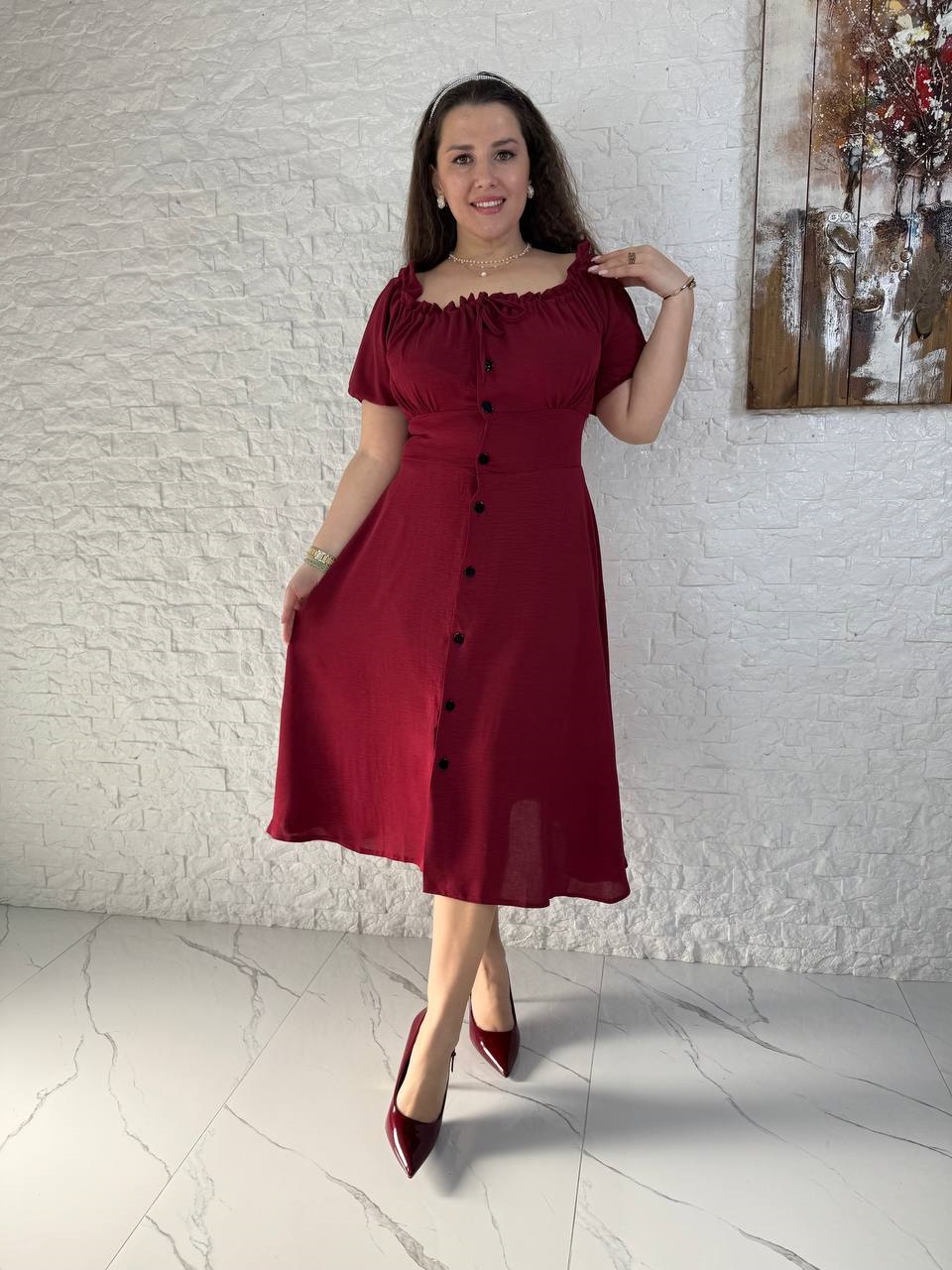 Удлиненное платье на пуговицах свободного кроя со шнуровкой по спинке+по горловине кулиска бордо