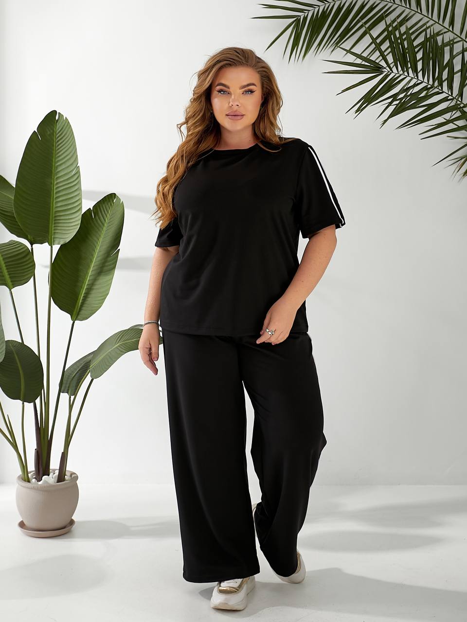 Удобный костюм-двойка: брюки свободного кроя с лентой+футболка (двунитка) черный