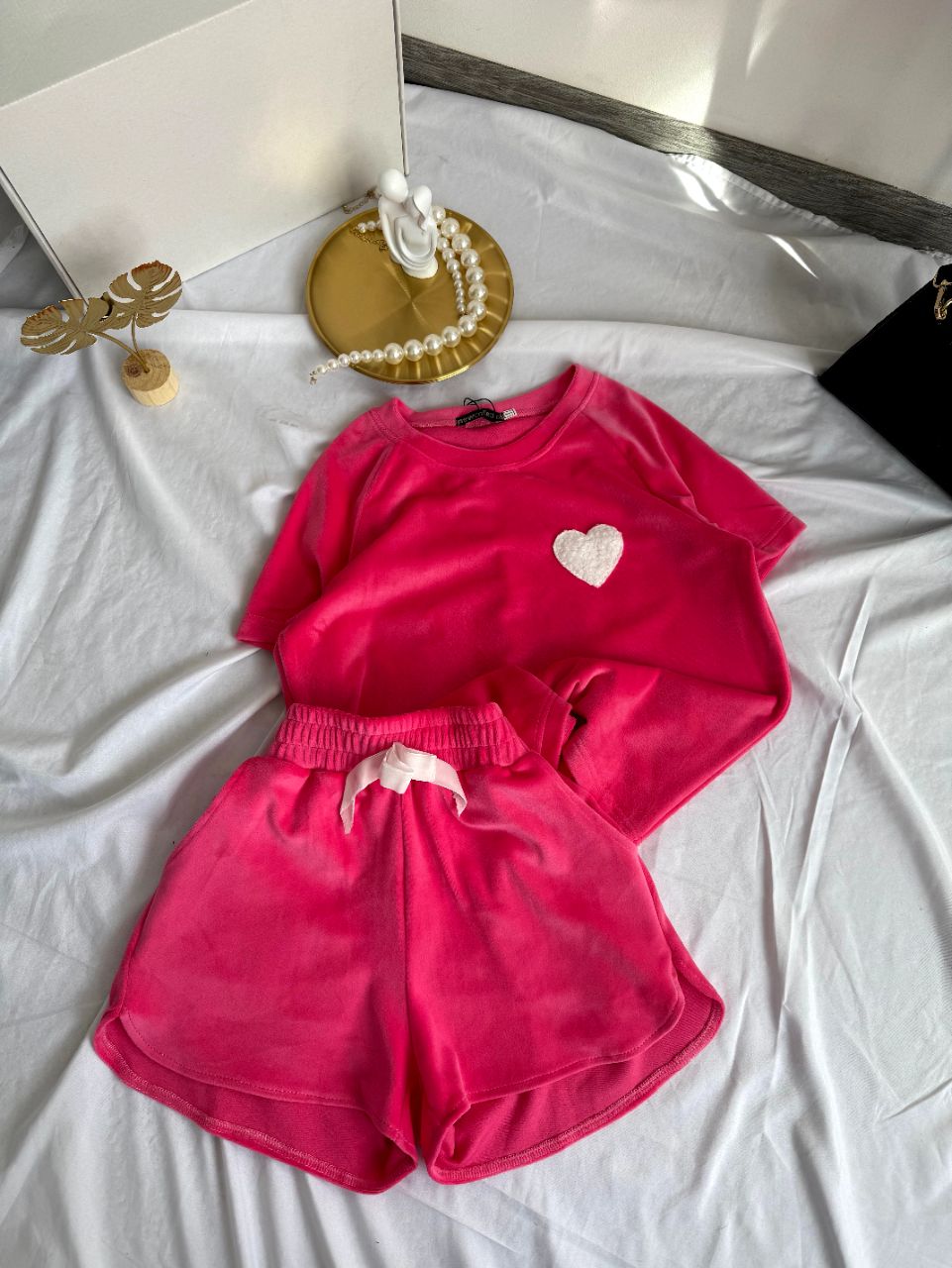 Будьте першим, хто залишив відгук “Удобный Костюм-пижама велюр спорт: футболка+шорты коралл”“