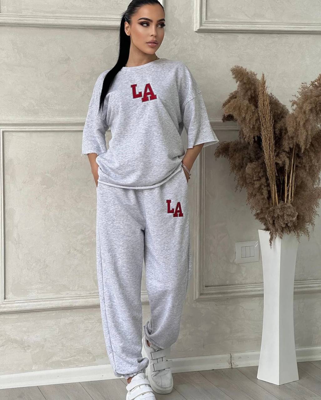 Удобный костюм свободного фасона с накатом (футболка+штаны) светло-серый
